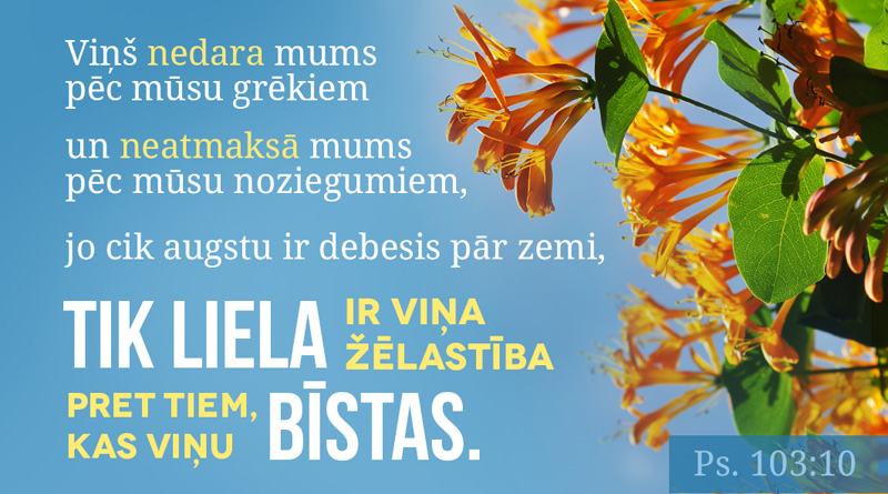 “Tāpēc es esmu pārliecināts, ka ne nāve, ne dzīvība, ne eņģeļi, ne varas, ne lietas esošās, ne nākamās, ne spēki, ne augstumi, ne dziļumi, ne cita kāda radīta lieta mūs nevarēs šķirt no Dieva mīlestības, kas atklājusies Kristū Jēzū, mūsu Kungā! /Bībele, Romiešiem 8:38,39/