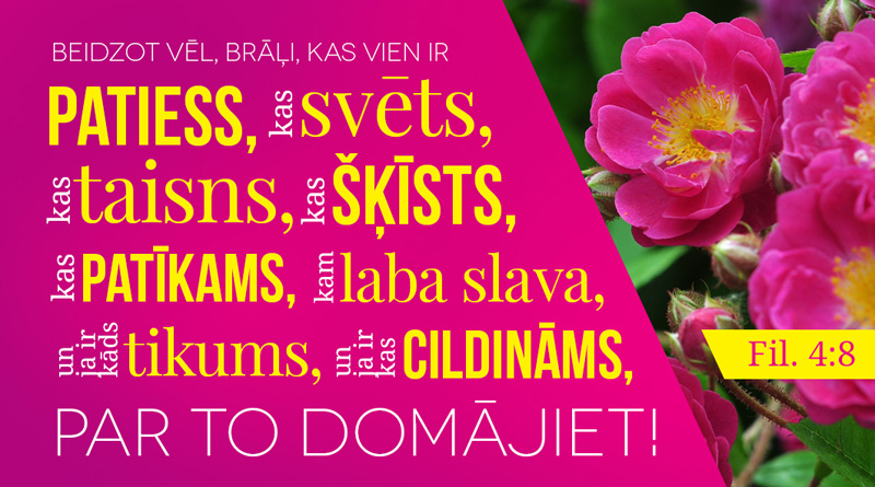 “Beidzot vēl, brāļi, kas vien ir patiess, kas svēts, kas taisns, kas šķīsts, kas patīkams, kam laba slava, ja ir kāds tikums un ja ir kas cildināms, par to domājiet!” /Filip. 4:8/
